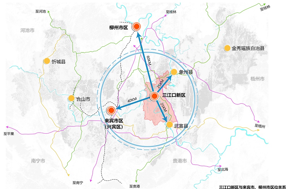 來賓市地處廣西中部地區(qū),緊鄰柳州、南寧兩大核心城市,北距柳州約65公里,西南距南寧約140公里,有“桂中腹地”之稱。三江口新區(qū)位于來賓市東部,是桂中“金三角”核心,也是“西江黃金水道重要節(jié)點(diǎn)”和“南柳經(jīng)濟(jì)走廊重要節(jié)點(diǎn)”,區(qū)位優(yōu)勢明顯。