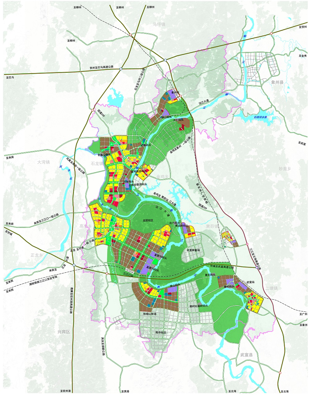 高效綜合交通系統(tǒng)規(guī)劃——以區(qū)域性交通互聯(lián)互通為突破點(diǎn),形成以港口、鐵路、公路為核心的多式聯(lián)運(yùn)對外綜合交通體系,強(qiáng)化以港口碼頭為中心建設(shè)通往柳州、河池等周邊城市以及通往粵港澳大灣區(qū)城市的黃金水道;重點(diǎn)推進(jìn)三江口新區(qū)產(chǎn)業(yè)組團(tuán)與國道209、國道355等區(qū)域性交通干道的銜接;完善以港區(qū)港口為支點(diǎn)的港產(chǎn)城融合發(fā)展體系:加快石龍碼頭、直壁溝碼頭、黃泥嶺碼頭及其配套設(shè)施的建設(shè),以港口為依托,完善集疏運(yùn)體系,促進(jìn)港口與腹地經(jīng)濟(jì)良性循環(huán)發(fā)展,驅(qū)動新區(qū)從“碼頭經(jīng)濟(jì)”走向港產(chǎn)城融合發(fā)展。